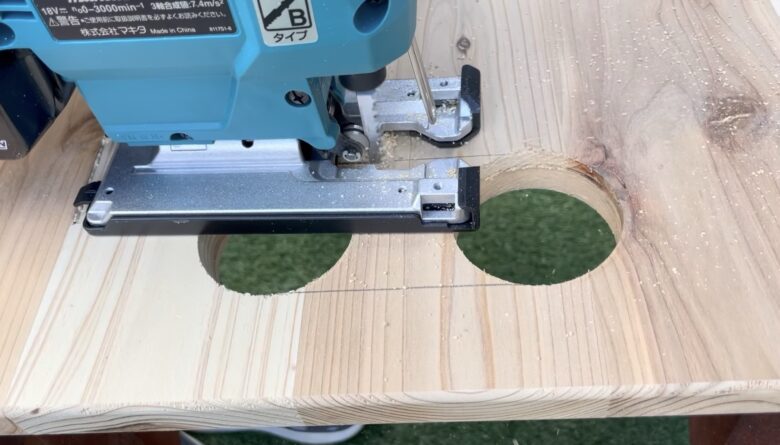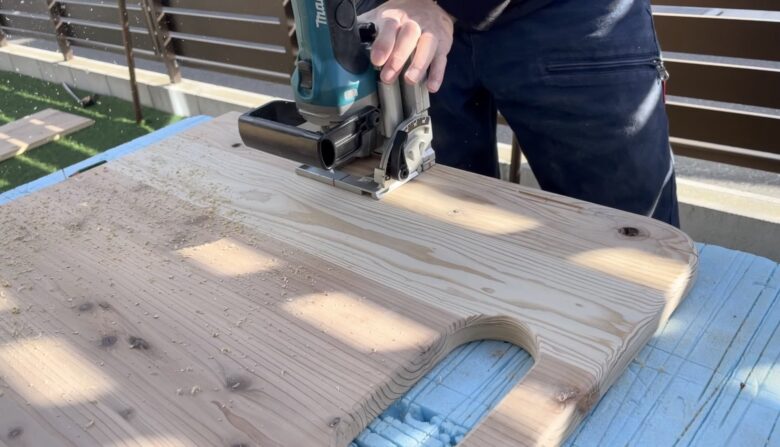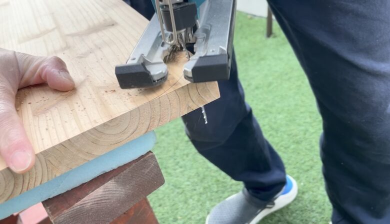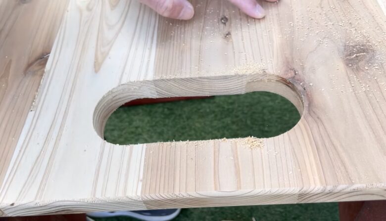 ジグソーで切ったままだとガタつきが出るので、サンダーで形を整えます。