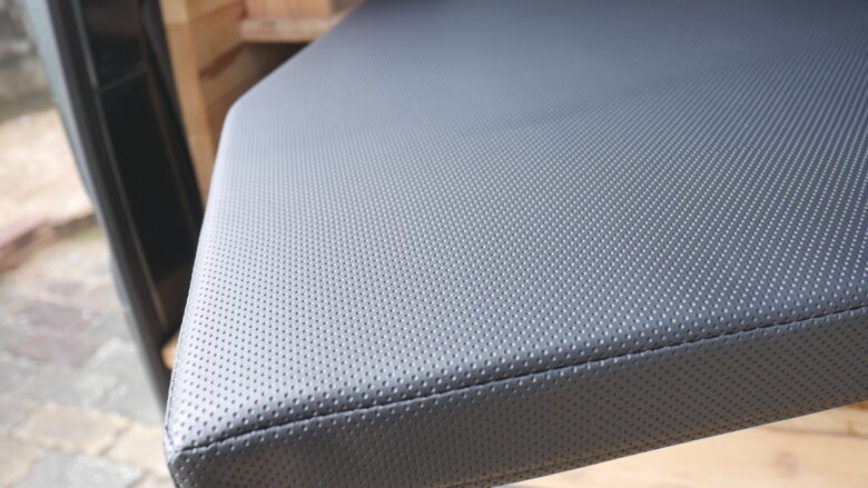 表面はPVCレザー系の素材で、水や汚れに強く、アウトドア用途に適しています。