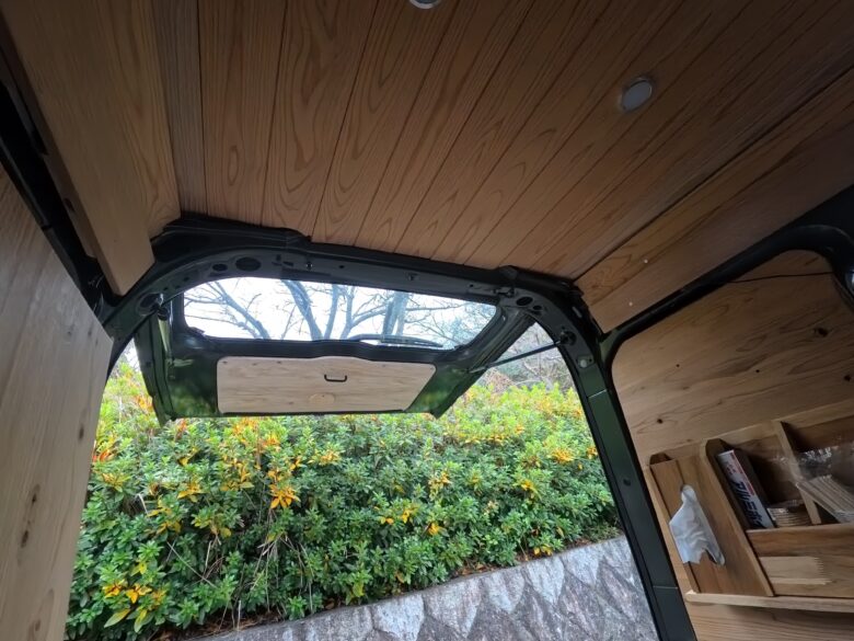そこで作ったのが、車内から開けられるバックドアパネル。
