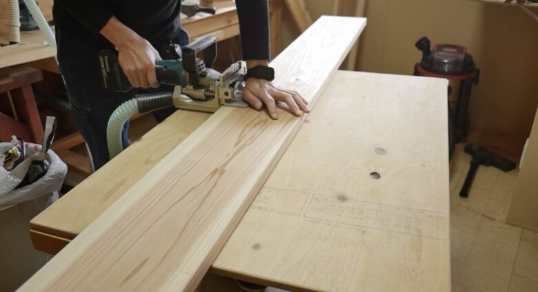 1枚だけでは幅が足りないため、2枚をビスケットジョイントで接ぎ合わせます。