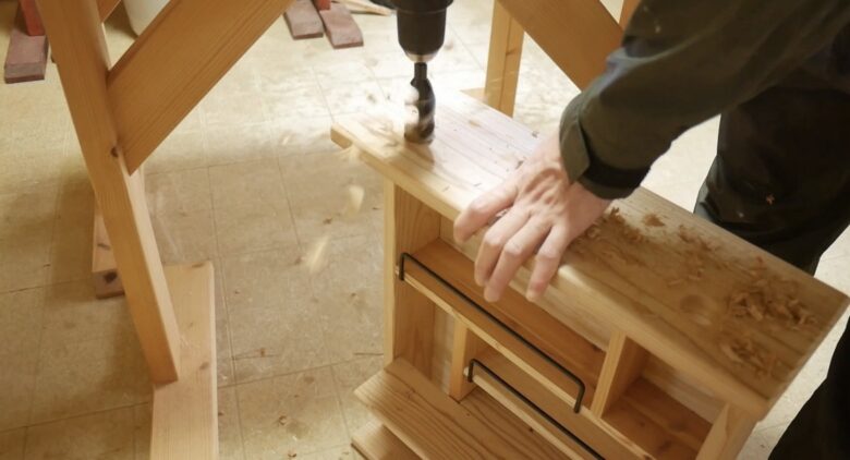 棚の上段・下段に、21mmの穴をあけます。
