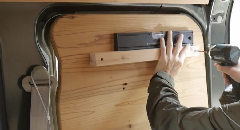 穴あけができたら、荷室の壁板にビス固定。